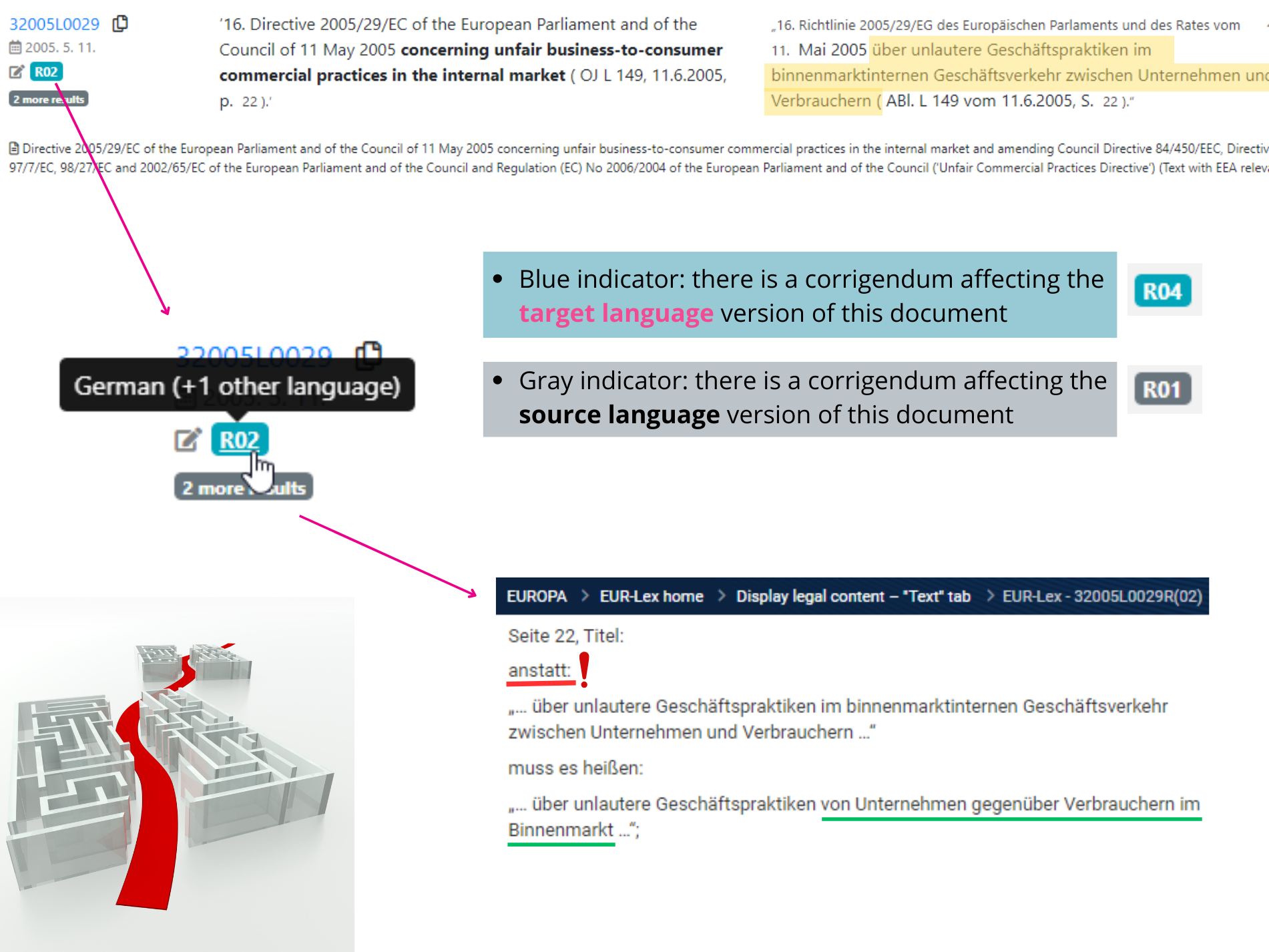 R(..)tag will appear. - 🖱 Clicking on the tag will direct you to the original EUR-Lex source of the corrigendum document itself. Here you can check in detail if your specific query phrase is affected by the corrigendum or not.