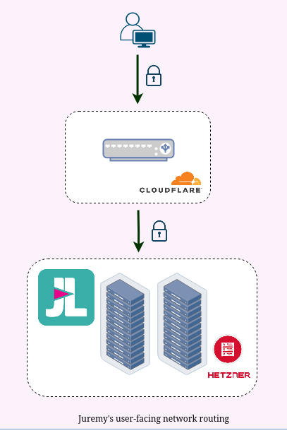 The padlocks indicate the presence of a TLS-secured connection. You can see, that there’s one such secure connection between you and the Cloudflare load balancers, and an other secure connection between Cloudflare and our Juremy servers (hosted within Hetzner’s data centers).