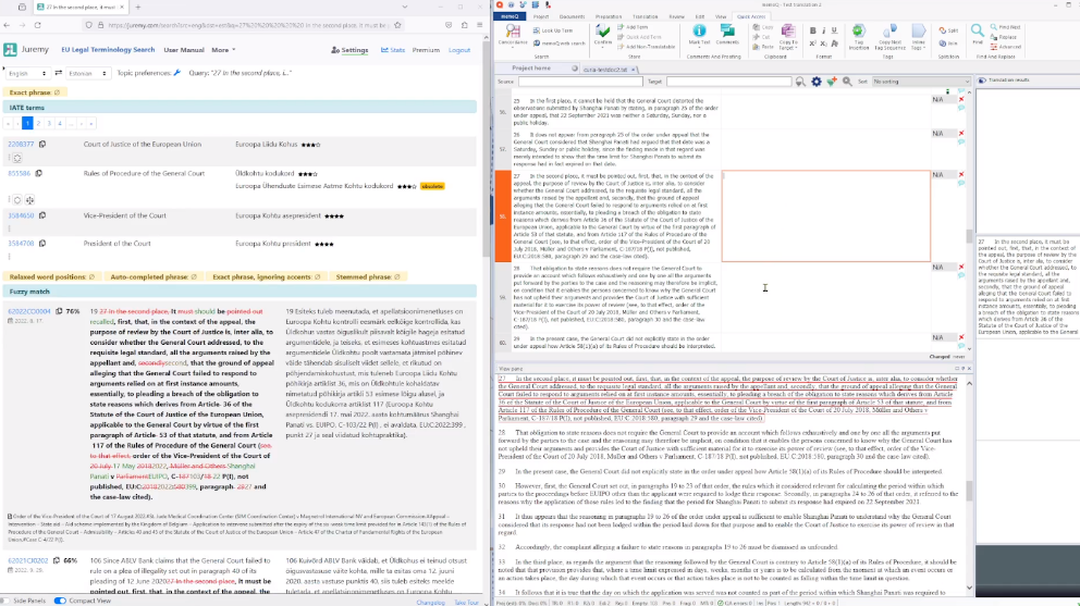 If screen estate is scarce, you can position the Juremy window behind memoQ and keep the “Raise on match” ticked. The Juremy window will then automatically pop to the top when an EUR-Lex match is found.