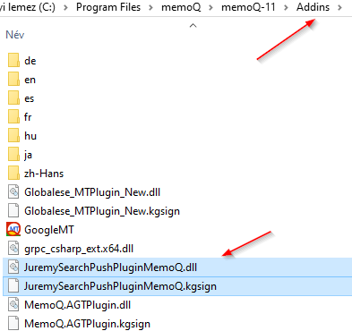 JuremySearchPushPluginmemoQ.dlland theJuremySearchPushPluginMemoQ.kgsignfiles to the Addins folder of your MemoQ installation, for example toc:\Program Files\memoQ\memoQ-11\Addins.