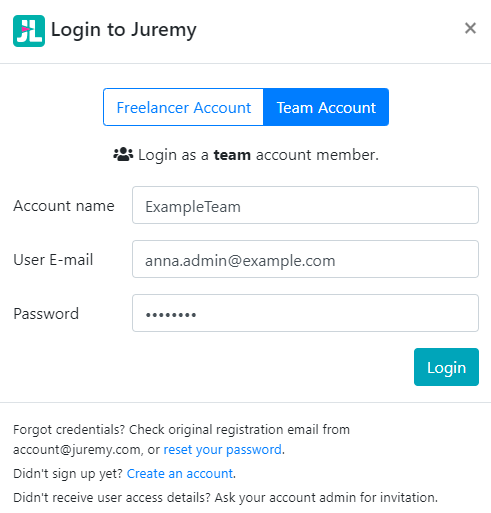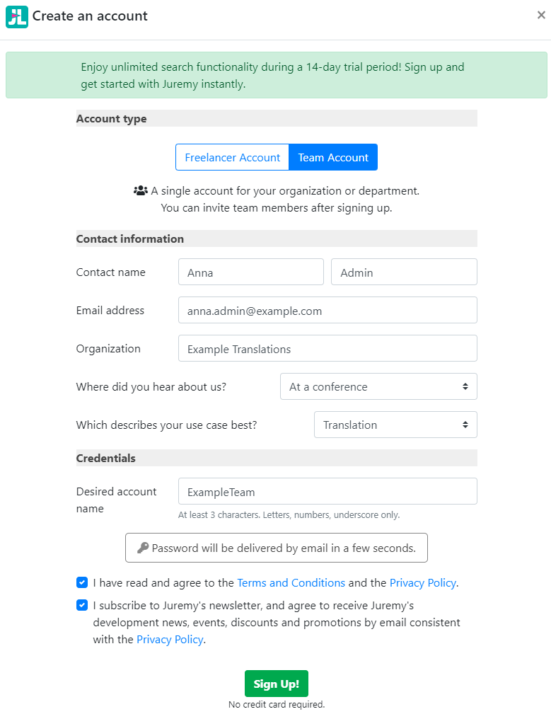 Once you clicked on the Sign Up button, your password will be delivered to your registration email automatically within a few seconds. With these credentials, namely the username and the received password, you will be able to login to Juremy by clicking on the blue Login button in the top right.