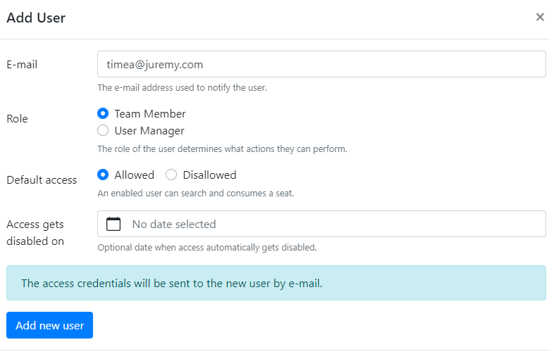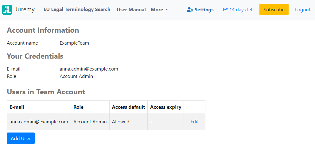 Please don’t register multiple email addresses per user to renew free trial periods at their expiry. We believe that the length of our free trial is sufficient to get acquainted with Juremy and to experience its benefits. We do not ask for credit card details or charge registered users upon expiry of their trial. If you like our service, please choose one of our subscription plans and support us in developing Juremy further.